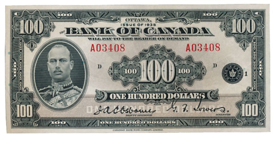 BANK OF CANADA. $100.00. 1935 Issue. English Text. BC-15. No. A03408/D. Unlisted in the C.P.M.S. Registry. A well centered AU note.