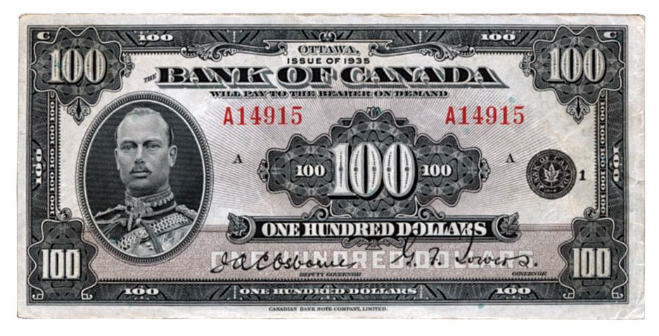 BANK OF CANADA. $100.00. 1935 Issue. English Text. BC-15. No. A14915/A. PMG graded Extra Fine-45. A choice, bright and attractive example.