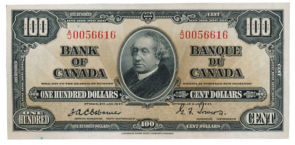 BANK OF CANADA. $100.00. 1937 Issue. BC-27a. No. A/J0056616. Osborne-Towers. Another well centered and bright Uncirculated note.