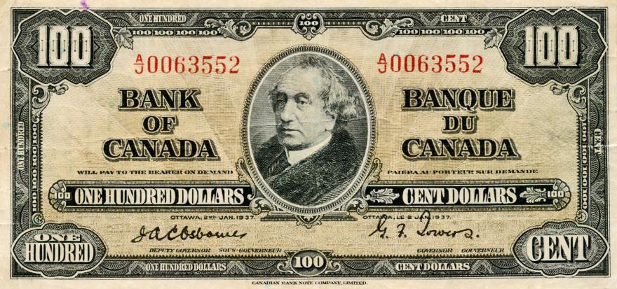 BANK OF CANADA. $100.00. 1937 Issue. BC-27a. Osborne. No. A/J0063552. VG+.