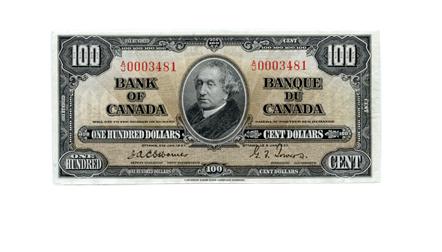 BANK OF CANADA. $100.00. 1937 Issue. BC-27a. Osborne-Towers. No. A/J0003481. CCCS graded Unc-63. Bright colours. A rare Unc note.