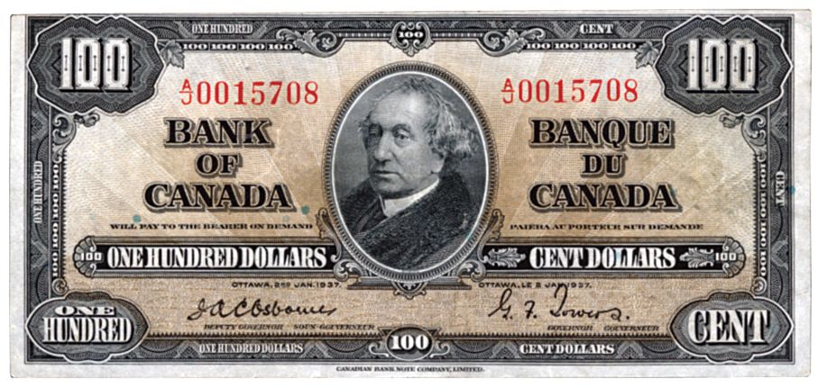 BANK OF CANADA. $100.00. 1937 Issue. BC-27a. Osborne-Towers. No. A/J0015708. PMG graded Extra Fine-40. An attractive example.