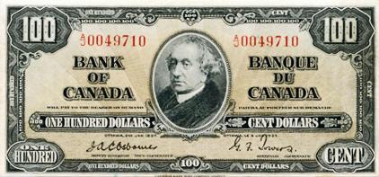 BANK OF CANADA. $100.00. 1937 Issue. BC-27a. Osborne-Towers. No. A/J0049710. PCGS graded Very Fine-35.