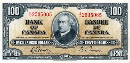 BANK OF CANADA. $100.00. 1937 Issue. BC-27b. Gordon-Towers. No. B/J2535065. Extra Fine. Ex. Lot #28. Torex. June/2007.