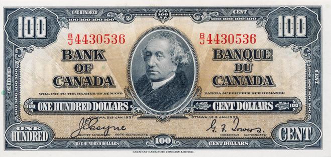 BANK OF CANADA. $100.00. 1937 Issue. BC-27c. Coyne-Towers. No. B/J4430536. PMG Unc-63.