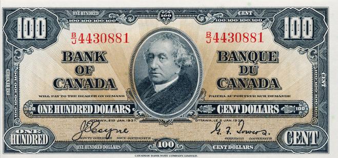 BANK OF CANADA. $100.00. 1937 Issue. BC-27c. Coyne-Towers. No. B/J4430881. PMG graded Unc-64. EPQ.