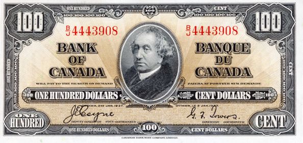 BANK OF CANADA. $100.00. 1937 Issue. BC-27c. Coyne-Towers. No. B/J4443908. PCGS graded Choice Unc-63. PPQ.