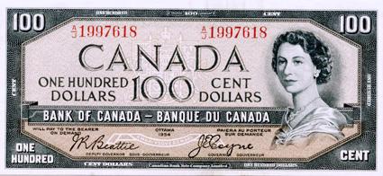 BANK OF CANADA. $100.00. 1954 Issue. BC-35b. Beattie-Coyne. ‘Devil’s Face’. No. A/J1997618. PMG graded Choice Uns-64.