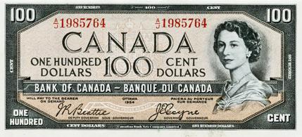 BANK OF CANADA. $100.00. 1954 Issue. BC-35b. ‘Devil’s Face’. No. A/J1985764. Extra Fine.