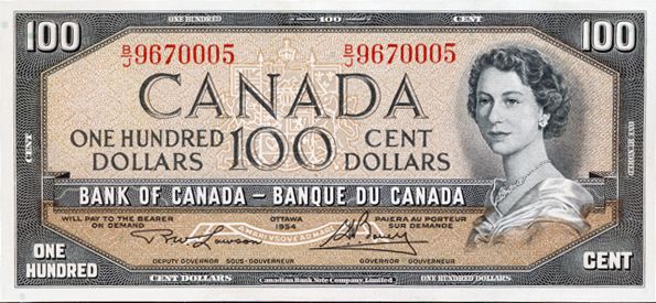 BANK OF CANADA. $100.00. 1954 Issue. BC-43c. No. B/J96700005. PCGS graded Choice AU-58. PPQ.