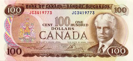 BANK OF CANADA. $100.00. 1975 Issue. BC-52a. Lawson-Bouey. No. JC3419773. CCCS graded Choice UNC-63.