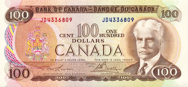 BANK OF CANADA. $100.00. 1975 Issue. BC-52a. Lawson-Bouey. No. JD4336809. CCCS graded Choice Unc-63. A short series.