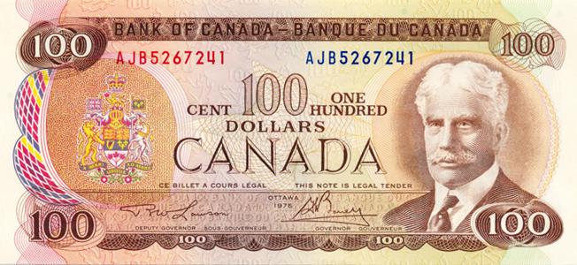 BANK OF CANADA. $100.00. 1975 Issue. BC-52a-i. Lawson-Bouey. No. AJB5267241. CCCS graded Choice Unc-64.