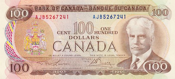 BANK OF CANADA. $100.00. 1975 Issue. BC-52a-i. Lawson- Bouey. No. AJB5267241. CCCS graded Choice Unc-64.