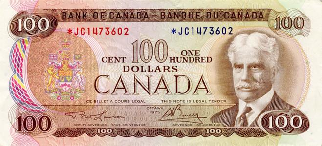 BANK OF CANADA. $100.00. 1975 Issue. BC-52aA. Lawson-Bouey. No. *JC1473603. Very Fine.
