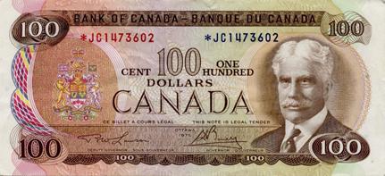 BANK OF CANADA. $100.00. 1975 Issue. BC-52aA. Lawson-Bouey. No. *JC1473603. Very Fine.
