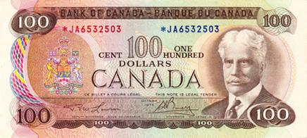 BANK OF CANADA. $100.00. 1975 Issue. BC-52aA. No. *JA6532503. PCGS graded Very Fine-35.