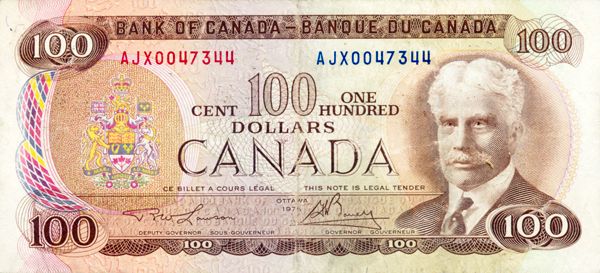BANK OF CANADA. $100.00. 1975 Issue. BC-52aA-i. Lawson-Bouey. No. AJX0047344. PMG graded Very Fine-20.