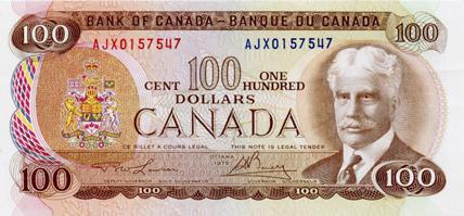BANK OF CANADA. $100.00. 1975 Issue. BC-52aA-i. Lawson-Bouey. No. AJX0157547. Very Fine.