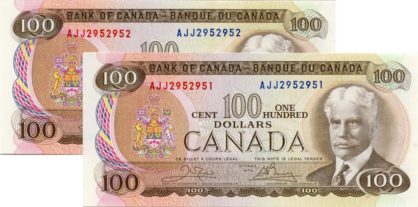 BANK OF CANADA. $100.00. 1975 Issue. BC-52b. Crow-Bouey. No. AJJ2952951 & AJJ2952952. Lot of two (2) consecutive CU notes.
