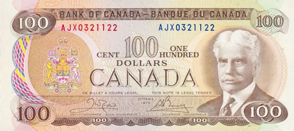 BANK OF CANADA. $100.00. 1975 Issue. BC-52bA. Crow- Bouey. No. AJX0321122. CCCS graded Mint State-64.