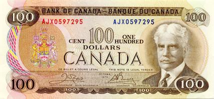 BANK OF CANADA. $100.00. 1975 Issue. BC-52bA. Crow-Bouey. No. AJX0597295. Bright and crisp AU-50.