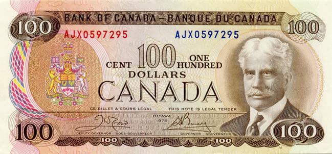 BANK OF CANADA. $100.00. 1975 Issue. BC-52bA. Crow-Bouey. No. AJX0597295. Bright and crisp AU-50.