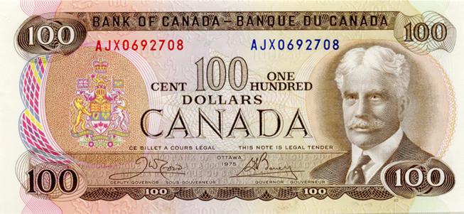 BANK OF CANADA. $100.00. 1975 Issue. BC-52bA. Crow-Bouey. No. AJX0692708. CU.
