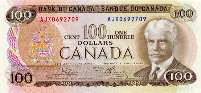 BANK OF CANADA. $100.00. 1975 Issue. BC-52bA. Crow-Bouey. No. AJX0692709. Unc.