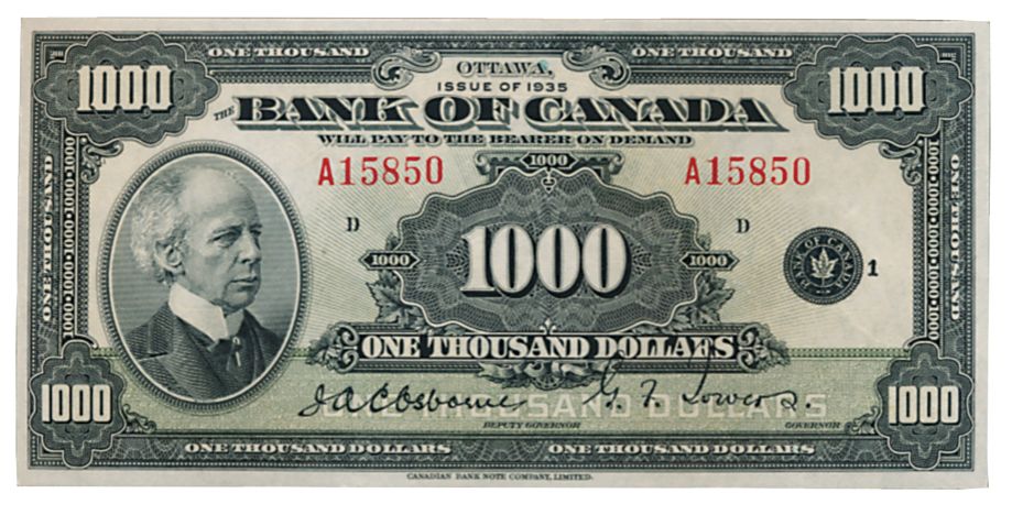 BANK OF CANADA. $1000.00. 1935 Issue. English Text. BC-19. No. A15850/D. Choice and crisp AU.