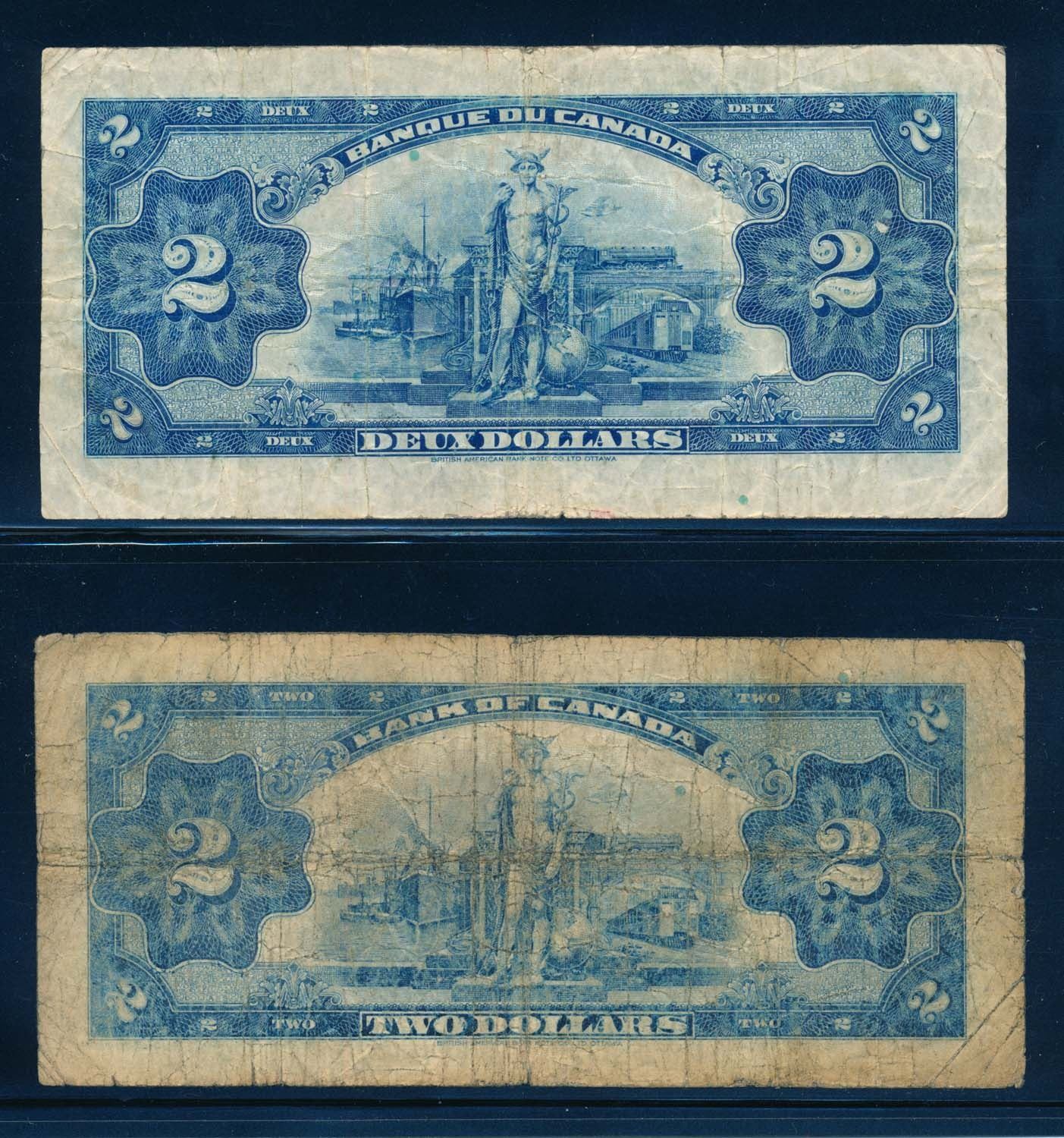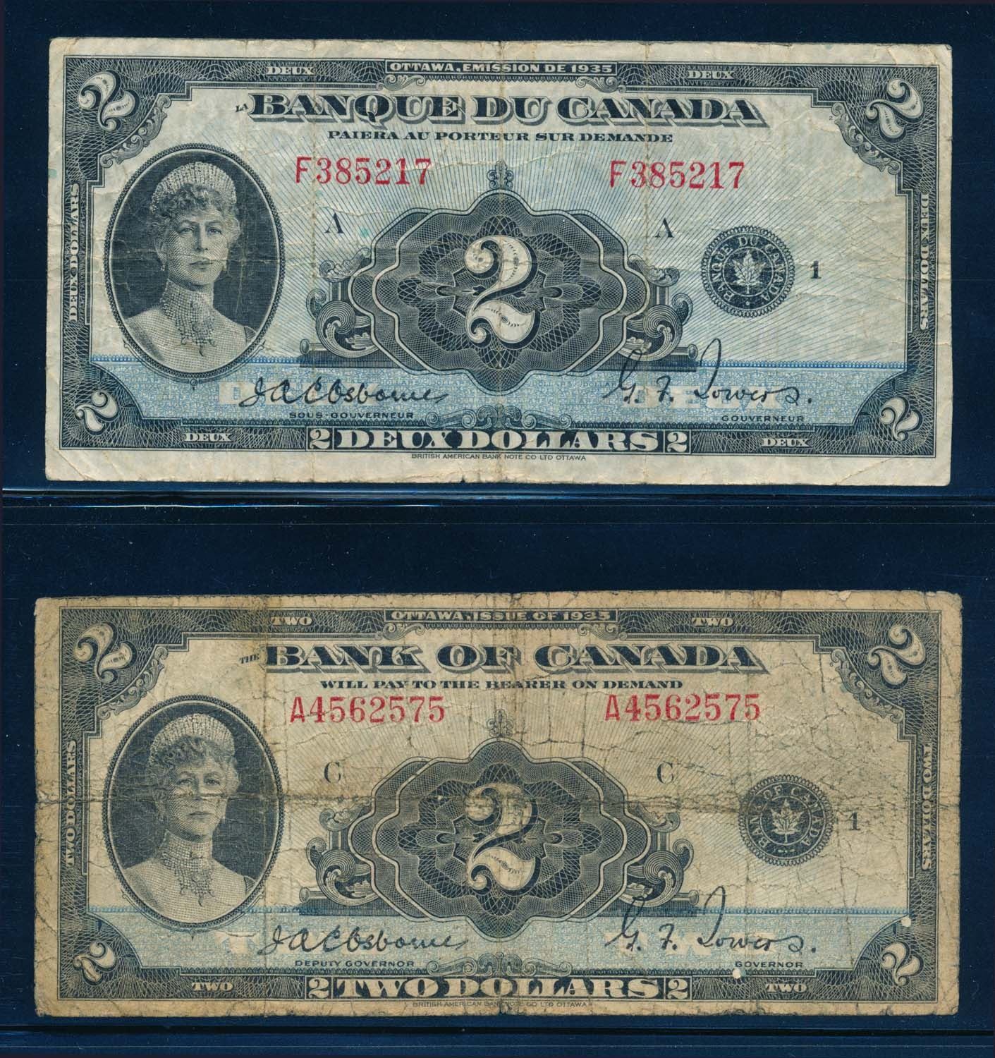 BANK OF CANADA 1935 $2.00 Osbourne-Towers Banknotes. Lot of 2 Notes in Low Grade