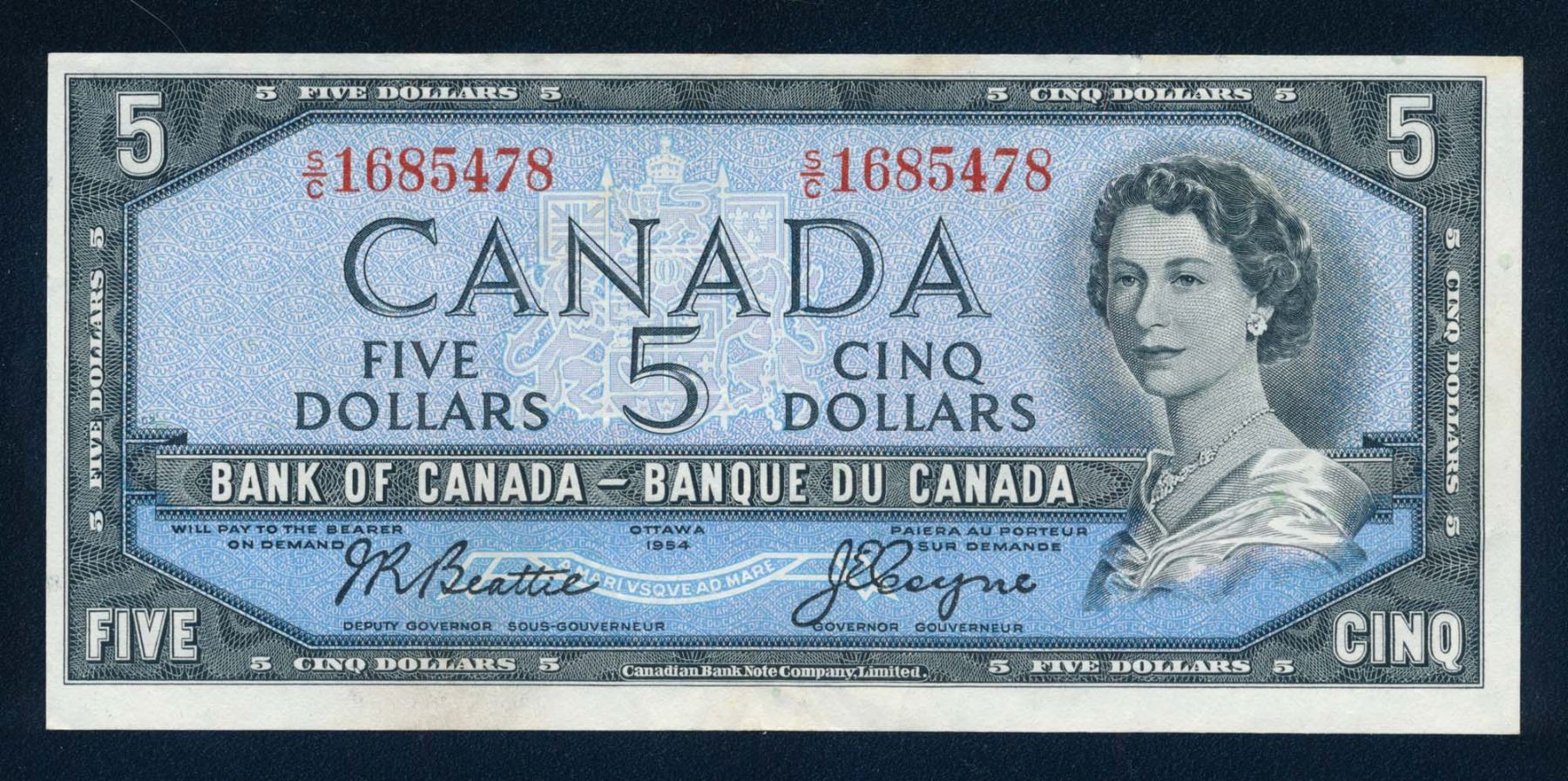BANK OF CANADA 1954 $5.00, BC-39a-i, Beattie-Coyne, Modified CBN. Graded: EF