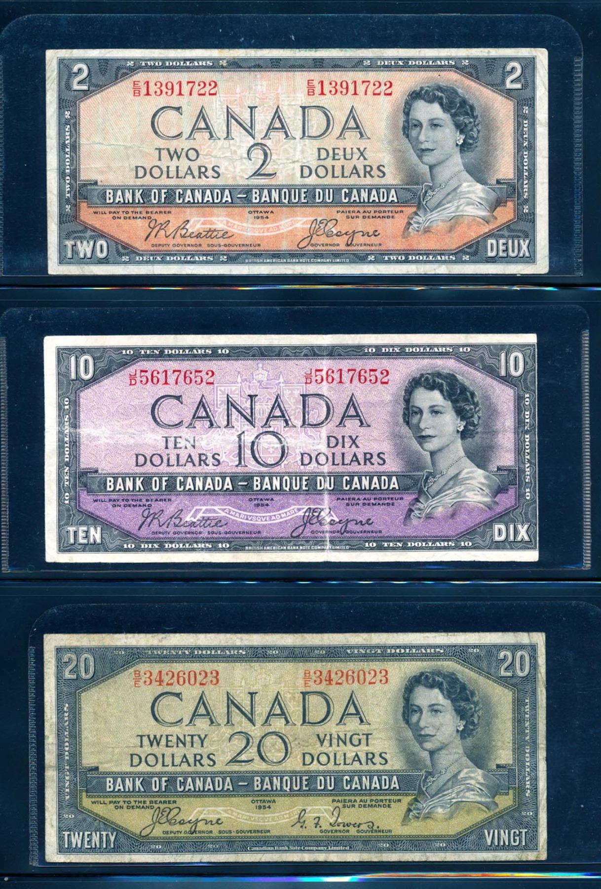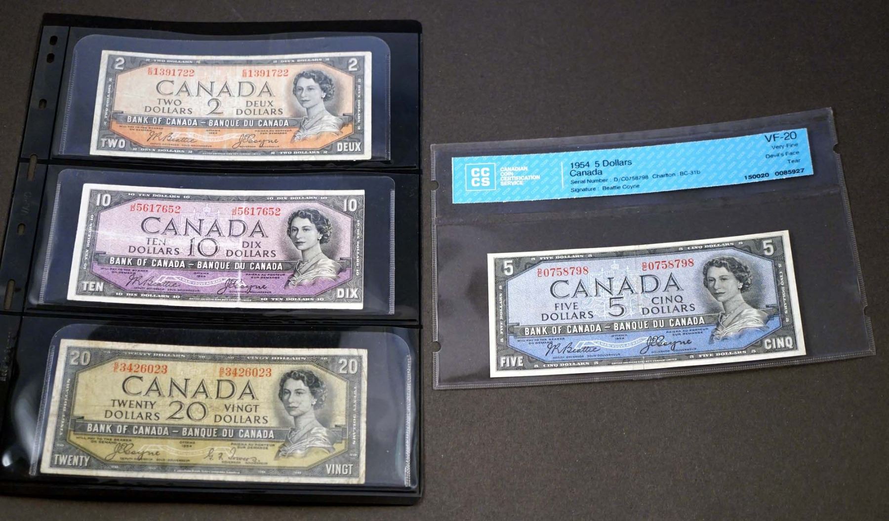 1 x BC-30b $2.00 E/B1391722 F, 1 x BC-31b $5.00 CCCS #0085927 S/N D/C0758798 VF-20, 1 x BC-32b S/N J/D5617652 trimmed VG and 1 x BC-33aS/n B/E3426023 F+