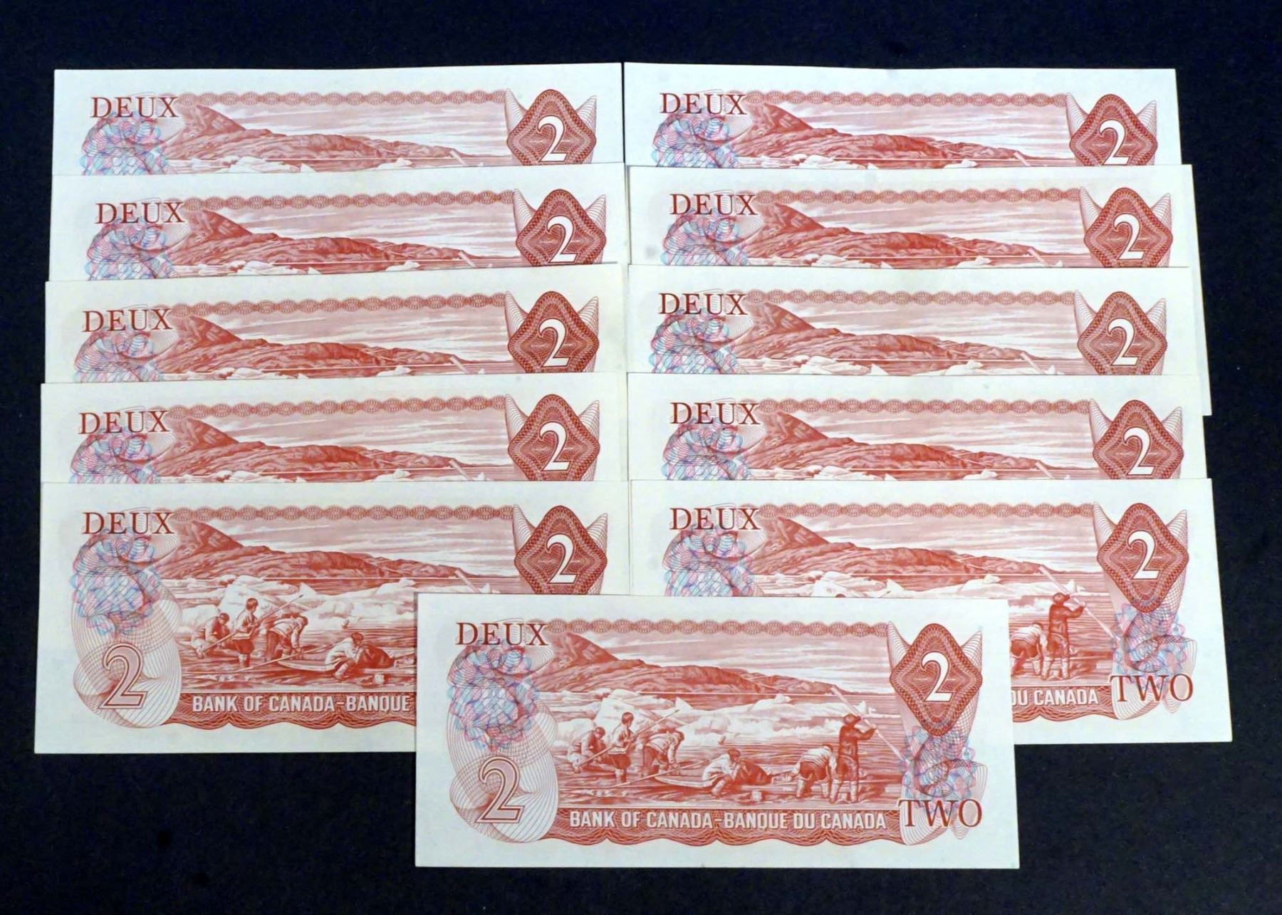 BANK OF CANADA 1974 $2.00, Lot of 11 Banknotes, BC-47d. GUnc