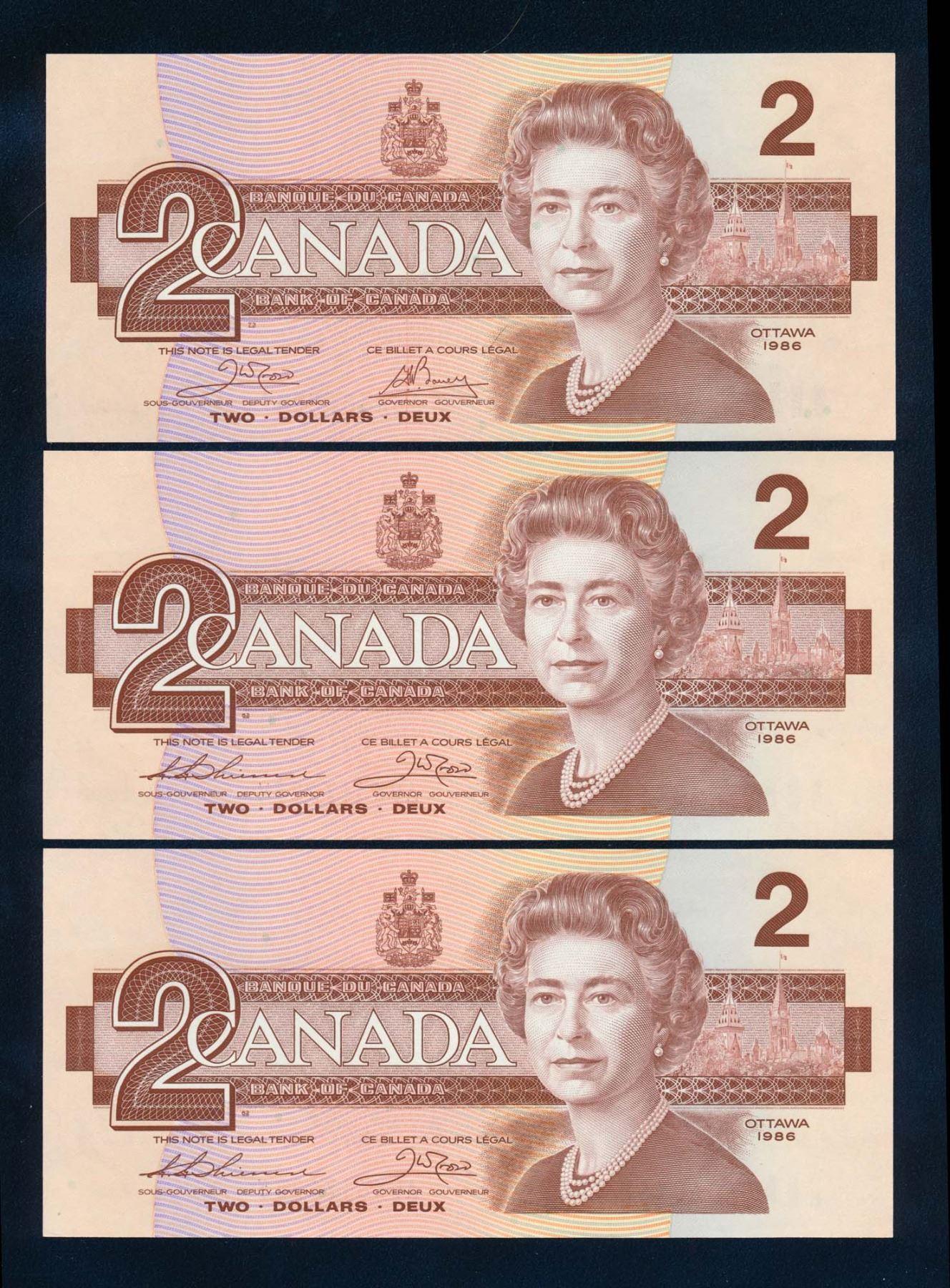 BANK OF CANADA 1986 $2.00 (3x), BC-55a, Crow-Bouey, Lot of Three & Graded: Gem Unc.