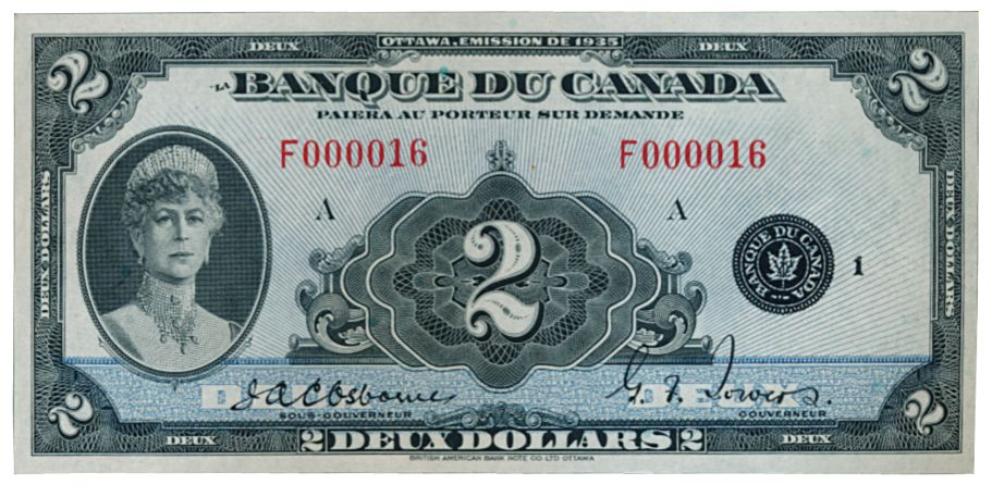 BANK OF CANADA. $2.00. 1935 Issue. French Text. BC-4. No. F000016/A. Unlisted in the C.P.M.S. Registry. A well centered, low serial numbered note. Choice AU.
