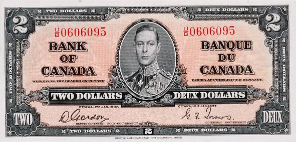 BANK OF CANADA. $2.00. 1937 Issue. BC-22b. Gordon- Towers. No. U/B0606095. BCS graded Unc-60, (original).