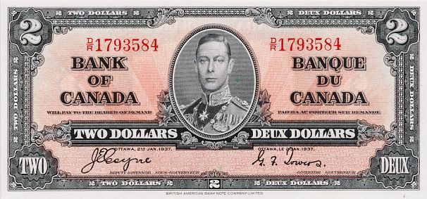 BANK OF CANADA. $2.00. 1937 Issue. BC-22c. Coyne-Towers. No. D/R1793584. BCS graded Choice Unc-63, (original).