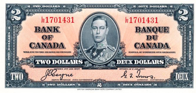 BANK OF CANADA. $2.00. 1937 Issue. BC-22c. No. L/R1701431. PMG graded Unc-64. PPQ.