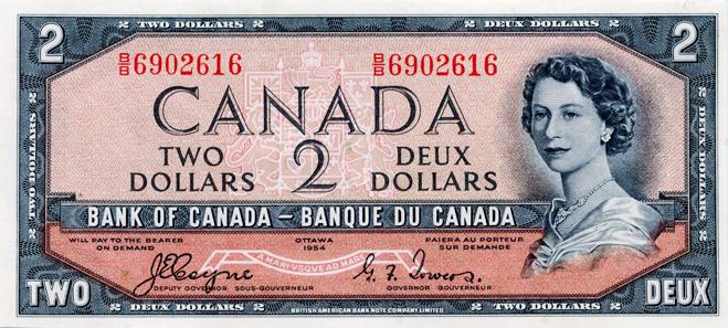 BANK OF CANADA. $2.00. 1954 Issue. BC-30a. 'Devil's Face' Issue. Coyne-Towers. No. B/B6902616. Choice Unc.