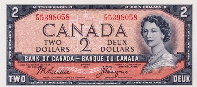 BANK OF CANADA. $2.00. 1954 Issue. BC-30b. 'Devil's Face'. Beattie-Coyne. No. F/B5398058. PMG graded Unc-64. EPQ.