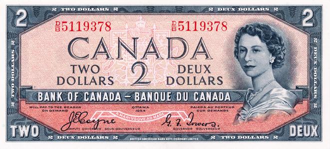 BANK OF CANADA. $2.00. 1954 Issue. BC-30b. 'Devil's Face' Issue. Beattie-Coyne. No. D/B5119378. PCGS graded CH AU-58. PPQ.