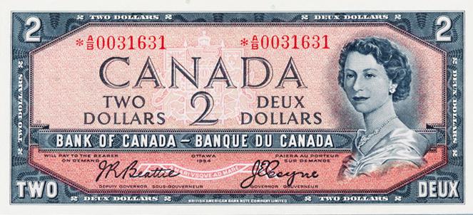 BANK OF CANADA. $2.00. 1954 Issue. BC-38aA. Modified. No. *A/B0031631. PMG graded Unc-64.