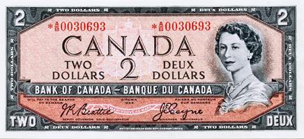 BANK OF CANADA. $2.00. 1954 Issue. BC-38aA. No. *A/B0030693. AU+.