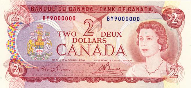 BANK OF CANADA. $2.00. 1974 Issue. BC-47a. No. BY9000000. PCGS graded Choice AU-50. PPQ.