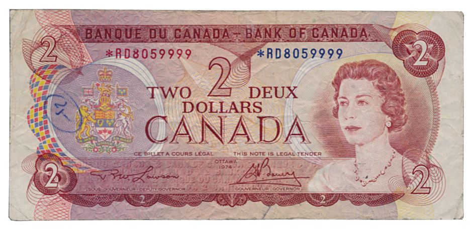 BANK OF CANADA. $2.00. 1974 Issue. BC-47aA. Lawson-Bouey. No. *RD8059999. A recently discovered, Replacement Note. Unlisted in Charlton. BCS certified and graded Fine-15. Number ‘25’ in ink at left on front. Believed to be Unique. (Cataloguer’s Note: Placing an estimate on a discovery note is highly difficult, if not impossible. The auction result will establish the value. MOORE’S will assist interested purchasers with guidance, upon request.)