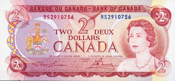 BANK OF CANADA. $2.00. 1974 Issue. BC-47aT. Lawson- Bouey. No. RS2910756. PMG graded Choice Unc-64.