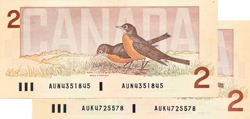 BANK OF CANADA. $2.00. 1986 Issue. BC-55a. Crow-Bouey. No. AUN4351845. No. AUK4725578. Both Choice Unc. Both scarcer prefixes.