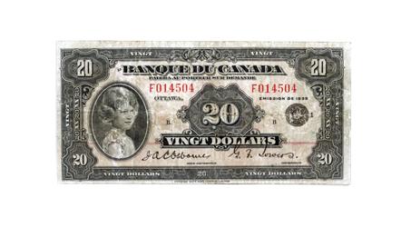 BANK OF CANADA. $20.00. 1935 Issue. BC-10. French Text. No. F014504/B. PMG graded VG-10. Net. Designated as processed. Somewhat faded tint.