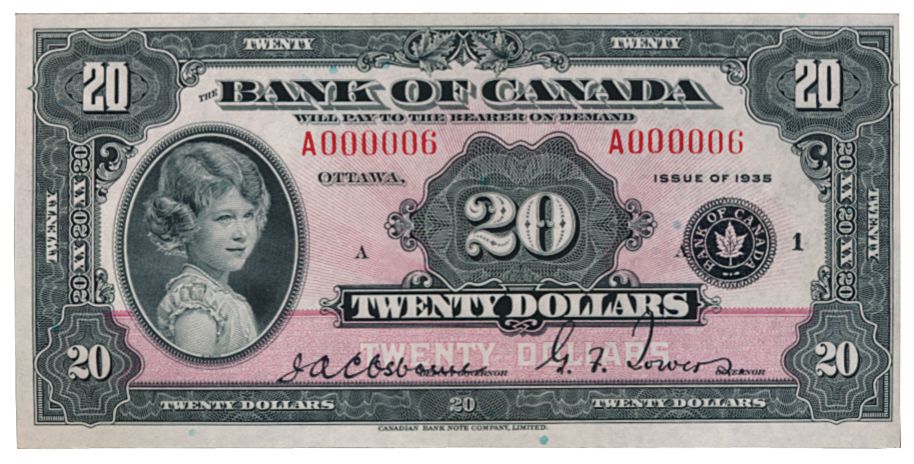 BANK OF CANADA. $20.00. 1935 Issue. English Text. BC-9a. Large Seal variety. No. A000006/A. Close cut right margin. A rare high grade and low serial numbered note. Choice AU.